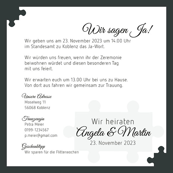 ACHTUNG: Das hellgraue Puzzle-Teil in der Abbildung unten symbolisiert die Stanzung in der Karte. Dieser Bereich ist bei geschlossener Einladung auf der Aussenseite sichtbar. Der graue Ton dient nur der Ver­anschau­lichung und wird nicht mitgedruckt.