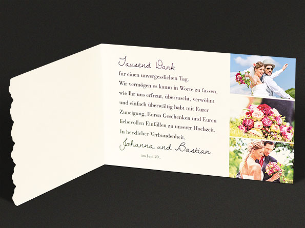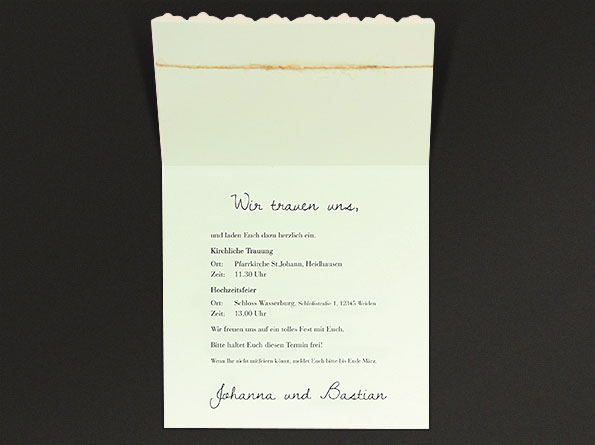Die Karten klappen nach oben auf, und Eure Einladungstexte werden auf einen stilvollen Einleger gedruckt. Verschlossen werden die Hochzeitseinladungen mit einer Juteschnur, an die ein kleines, rundes Kärtchen geknüpft werden kann – ideal für Eure Initialen, das Hochzeitsdatum oder eine liebevolle Botschaft.