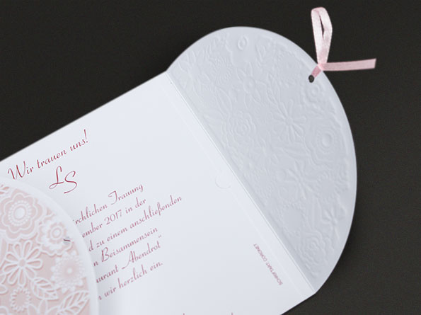 Verschlossen wird die Einladung durch ein rosa Bändchen.