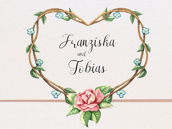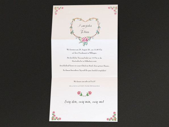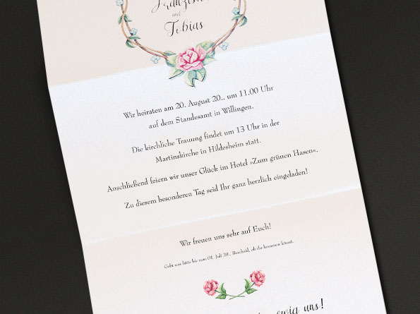 Hübsche, verspielte Hochzeitskarten, ideal um zu einer Hochzeitsfeier auf dem Land oder im Garten einzuladen. Die auf einen perlmuttartig schillernden Karton gedruckten Rosenblüten und Blumenranken schaffen ein heiteres, freundliches Erscheinungsbild. Die Einladungskarten sind zweimal gefalzt.