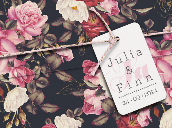 Hochzeitseinladungen mit Rosen-Aquarell. Gefertigt aus mattem Aquarellkarton, in Form einer Tasche. Verschlosen werden die Karten mit einer Kordel. An die Kordel können kleine Kärtchen angeknüpft werden.