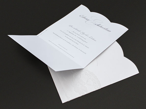 Entscheidet Euch jetzt für diese eleganten Hochzeitseinladungen mit Spitze und lasst Eure Einladungstexte von unseren Profis passend zur Karte gestalten – hochwertig, stilvoll und unvergesslich!