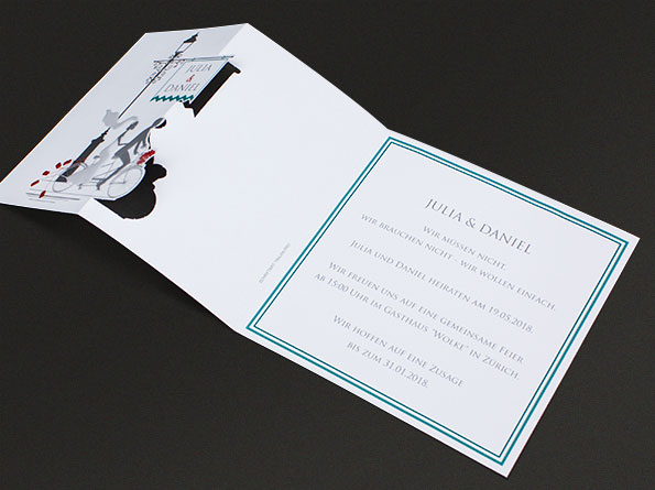 Die Karten beeindrucken durch emailleartig glänzende Prägungen, liebevolle Formstanzungen und eine raffinierte Falzung, die für eine einzigartige Optik sorgt. Eure Einladungstexte werden individuell gestaltet und perfekt auf das Design der Karte abgestimmt.
