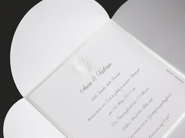 Im Inneren befindet sich ein hochwertiger Einleger, auf den Eure Einladungstexte gedruckt werden. Auch dieser ist mit einer dezenten Prägung versehen und verleiht der Karte eine besondere Wertigkeit. Eine elegante, weiße Schleife rundet das romantische Design ab.