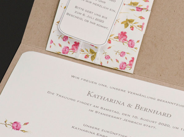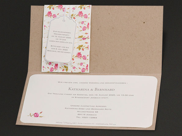 Hochzeitseinladung aus braunem Kraftkarton, links umfasst von einer weißen, mit rosa Blümchen bedruckten Banderole, sowie einem weißen Bändchen an welches ein kleines Kärtchen geknüpft ist.