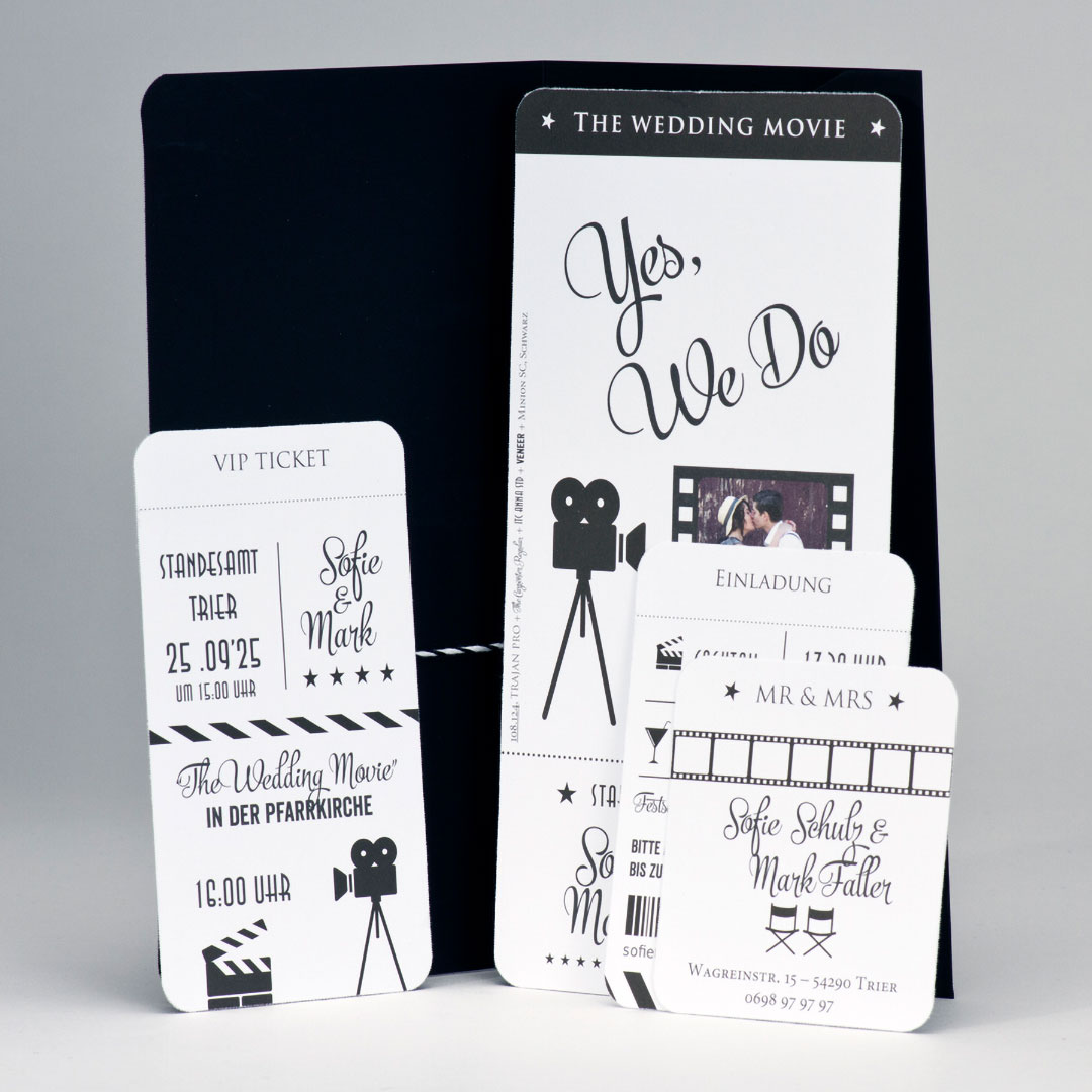 Originelle Einladungskarten zur Hochzeit, gearbeitet als Pocketkarte. Eine große Karte, sowie drei kleinere Zusatzkärtchen bieten viel Platz für Informationen. Alles in ausgefallenem Design gestaltet. Viele kleine Symbole lassen Filmset-Atmosphäre entstehen. Ein Highlight ist Euer persönliches, in die Karte gedruckte Foto. Natürlich kann das auch wegbleiben, wenn Ihr das Wünscht. Hergestellt sind diese Hochzeitseinladungen aus mattem schwarzen Karton, auf welchem eine seidig-glänzende Filmkamera aufgedruckt ist. Noch zu erwähnen bleibt eine Kordel, an die ein kleiner Anhänger geknüpft werden kann. Die Karten werden nach links aufgeklappt.