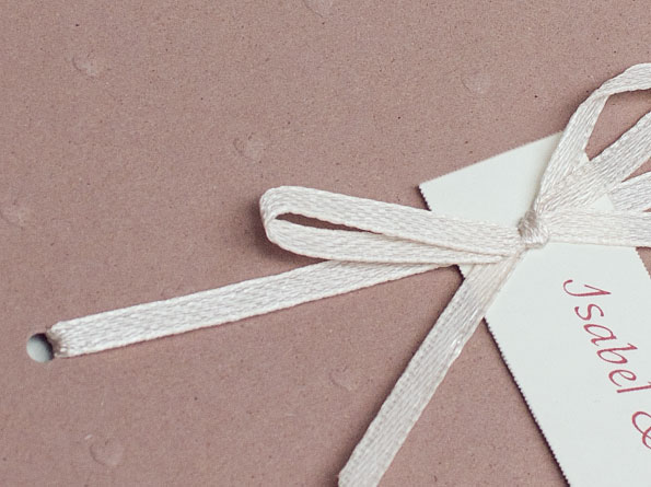 Einladungskarten zur Hochzeit, Vintage-Style, gefertigt aus einem leicht ins Violette spielenden Kraftkarton. Geprägte kleine Herzen, mit einer Schleife anzuknüpfter Anhänger. Die Texte drucken wir auf einen Einleger, der in die Karten eingesteckt wird.