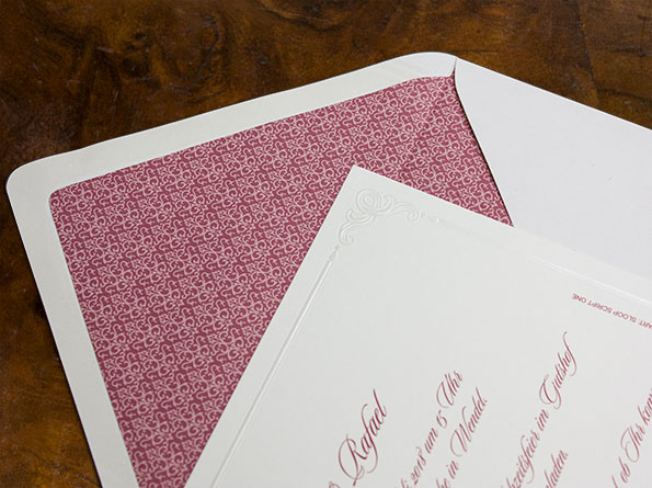 Die Karten sind keine Klappkarten, sondern beeindrucken durch ihr großes Format und den hochwertigen, haptisch ansprechenden Karton. Ein besonderes Highlight sind die gefütterten Kuverts, die auf der Innenseite in edlem Rot bedruckt sind – für eine rundum perfekte Einladung.