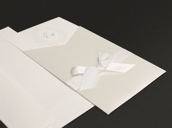 Cremefarbige Hochzeitskarten aus strukturiertem Naturkarton, die in eine ebanfalls cremefarbige, aber perlmuttartig, irisierende Hülle eingesteckt wird. Keine Klappkarte. Die Einladungen sind mit einer verspielten und seidenmatt lackierten Prägung dekoriert. Abgerundet werden diese schicken Hochzeitskarten von einer weißen, um die Hülle gebundenen Schleife.