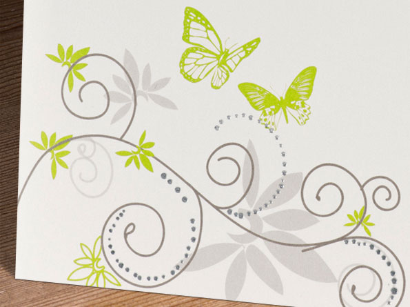 Weiße Hochzeitseinladungen mit grünen Akzenten und Schmetterlingen, sowie grauen Blumenranken.