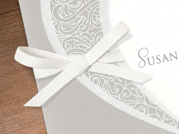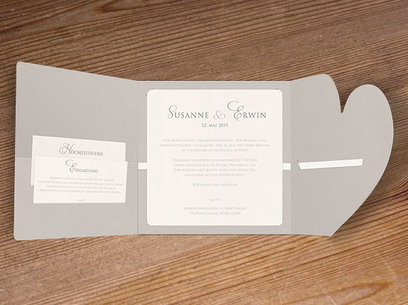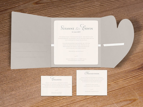 Diese hochwertigen Einladungskarten zur Hochzeit beeindrucken mit einer eleganten Dreifachfaltung und einer besonderen Druckfarbe in Velouroptik. Ein passendes Satinbändchen verleiht den Karten eine edle Note, während zwei verschmelzende Herzen auf grauem Naturkarton Eure Liebe symbolisieren.