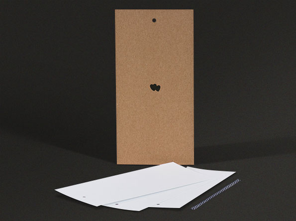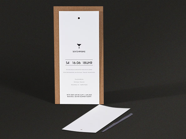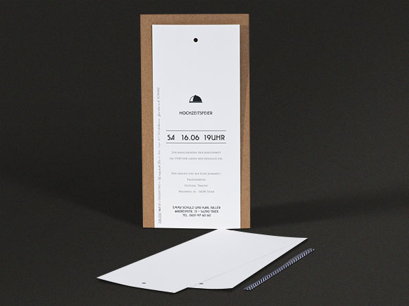 Drei Blätter aus stabilem, weißen Karton werden mittels Bändchen an eine Unterlage aus Kraftkarton angeknüpft. So ensteht eine besonders vielseitige Einladungskarte zur Hochzeit im beliebten Vintage-Style.