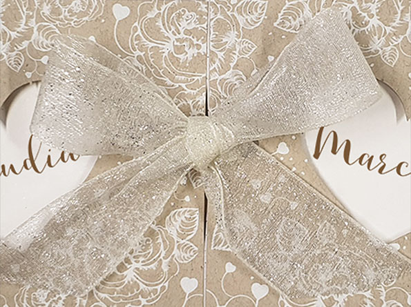 Verliebte Herzen, ein Hauch von Glitzer und liebevolle Details: Diese romantischen Hochzeitseinladungen setzen ganz auf Gefühl. Zwei gestanzte Herzen in den seitlichen Klappen geben den Blick auf die Namen des Brautpaares frei – verbunden durch eine funkelnde Schleife, die gleichzeitig als stilvoller Verschluss dient.