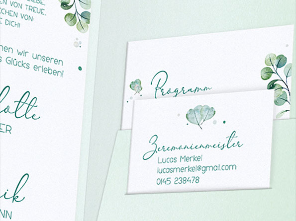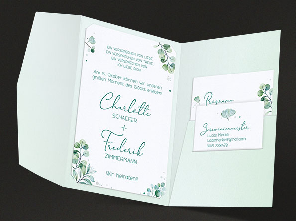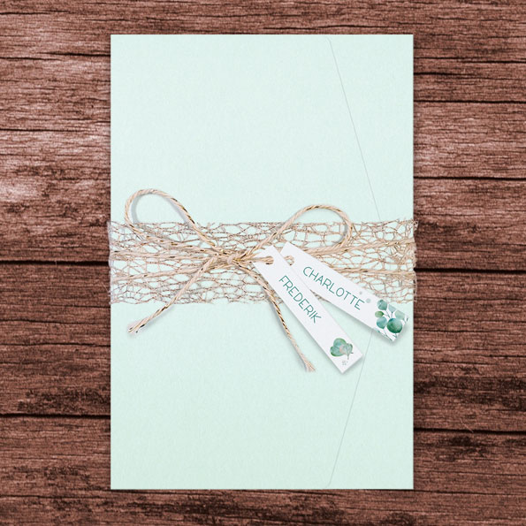 An die Kordel können kleine Anhänger mit den Namen des Hochzeits-Paares angeknüpft werden. Hiervon stehen drei verschiedene Versionen zur Auswahl. Gefertigt sind die Einladungskarten zur Hochzeit aus mint-grünem, schillernden Karton. Diese als Mappe hochwertig gestaltete Hochzeits-Papeterie enthält innen einen großen Texteinleger, sowie zwei kleine Zusatzkärtchen, welche mit Textinformationen für die Hochzeitsgäste, wie Geschenkwünschen, etc. bedruckt werden können. Die Einleger bestehen ebenfalls aus schillerndem, jedoch weißen Material.