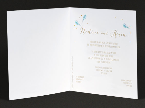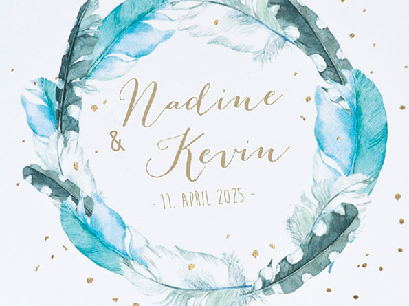 Verspielt, schlicht und elegant. Widersprüchliche Beschreibungen? Sicher, aber auf diese Einladungskarten durchaus zutreffend. Ein weißer, matter Naturkarton mit aufgedrucktem Aquarell-Federkranz in zarten Blautönen, sowie In goldenem Foliendruck ausgeführte Konfettis geben diesen Karten ein besonderes Outfit. Bestens geeignet um zu einer angesagten BoHo-Hochzeit einzuladen.