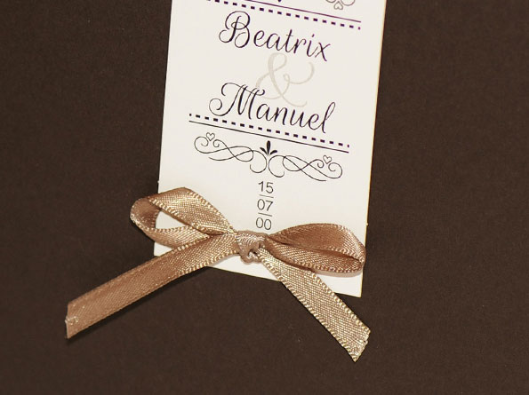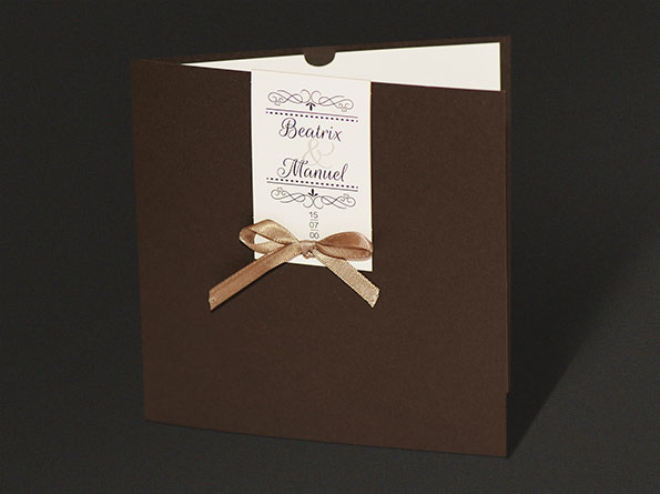 Sehr elegante Einladungskarten zur Hochzeit. In den braunen Umschlag wird rechts innen ein weißer Texteinleger eingeklemmt. An die linke Seite wird mittels eines Satin-Bändchens ein Zusatzkärtchen angeknüpft welches mit den Namen des Brautpaares und anderen Infos bedruckt werden kann. Die Hochzeitseinladungen werden nach links aufgeklappt.